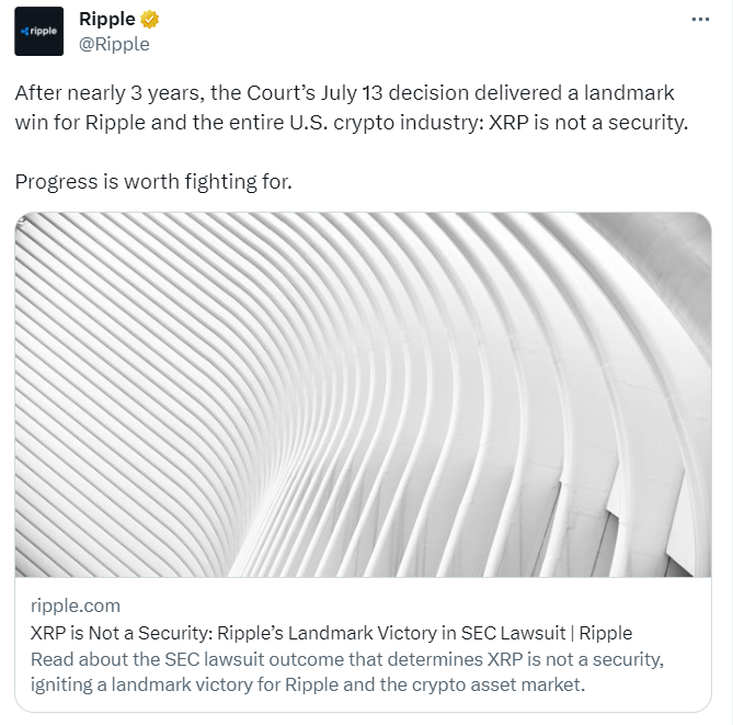 이어 리플은 "이번 소송의 쟁점은 딱 하나였다. 암호화폐(토큰)인 XRP가 투자 계약이 될 수 있는지 여부, 즉 현행법 상 XRP가 증권으로 간주될 수 있는지 여부를 가리는 것이었다. 법원은 XRP 자체는 증권이 아니라고 분명히 판결했다. SEC의 무리한 주장은 법적 관점에서 잘못됐다는 점이 확실해졌다. 이는 암호화폐 시장 전반으로 봐도 역사적인 사건"이라고 설명했다.