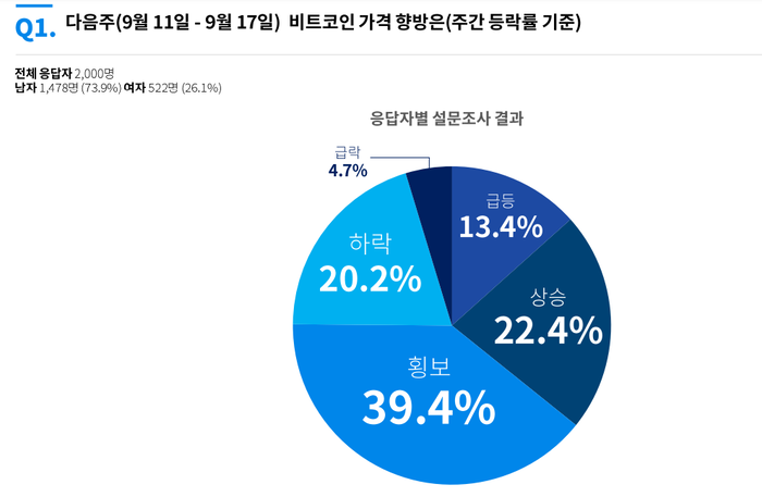 국내 암호화폐 투자자 10명 중 4명이 이번 주(9월11일~15일) 비트코인(BTC) 가격이 횡보할 것으로 전망했다.