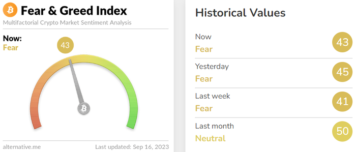 이날 암호화폐 데이터 제공 업체 알터너티브(Alternative)의 자체 추산 '공포·탐욕 지수'는 43을 기록하며 '공포' 단계가 계속됐다. 전월(중립 단계)와 비교하면 7포인트 낮은 수치다.