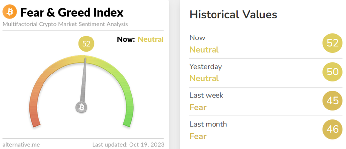 투자심리도 개선되는 모양새다. 암호화폐 데이터 제공 업체 얼터너티브(Alternative)의 자체 추산 '공포·탐욕 지수'는 전날보다 2포인트 오른 52를 기록하며 '중립' 단계가 지속됐다. 해당 지수는 0에 가까울수록 시장의 극단적 공포를 나타내며, 100에 가까울수록 극단적 낙관을 의미한다.