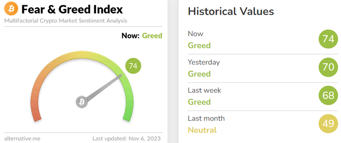 비트코인 강세장 진입 신호?...'공포·탐욕 지수' 74, 2021년 11월 이후 처음